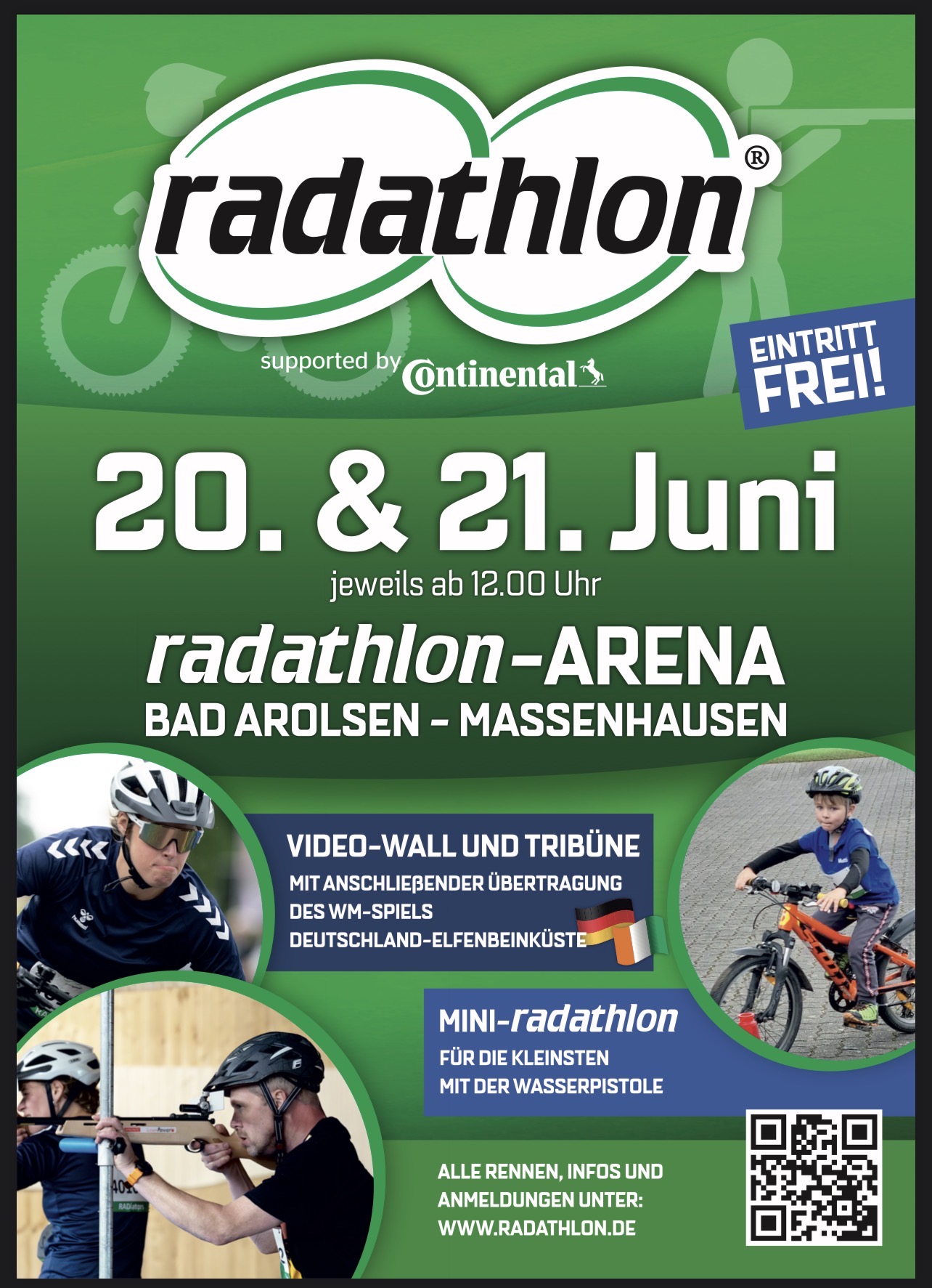 Für die Jüngsten gibt es das Kinder-Event in der speziell aufgebauten Radathlon-Arena. Hier fahren Kinder unter 12 Jahren in einer sicheren Umgebung und mit viel Spaß – geschossen wird mit Wasserpistolen. Ein zentrales Element aller Rennen ist das Laserschießen: Neben Ausdauer zählt hier vor allem Konzentration, denn jeder Fehlschuss führt zu einer Strafrunde.